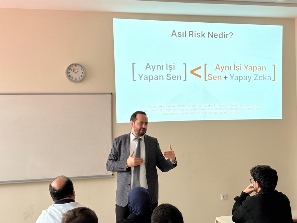 The presentation, starting from the question "Will artificial intelligence take our jobs?", stated that the real issue is not the complete disappearance of professions, but rather the change in how professions are performed.It was explained that artificial intelligence offers strong support, especially in conceptual and procedural tasks;however, human-centered skills such as strategic thinking, asking the right questions, establishing context, and decision-making retain their importance.